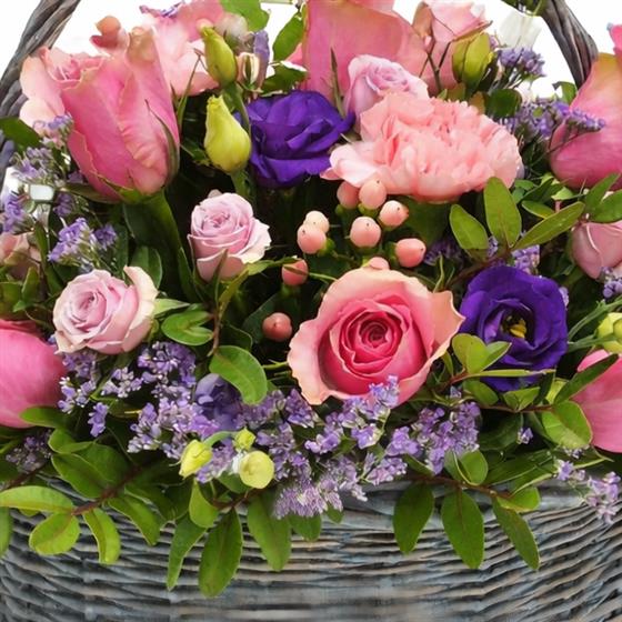 A basket of beautiful blooms in pinks, purples and lavender